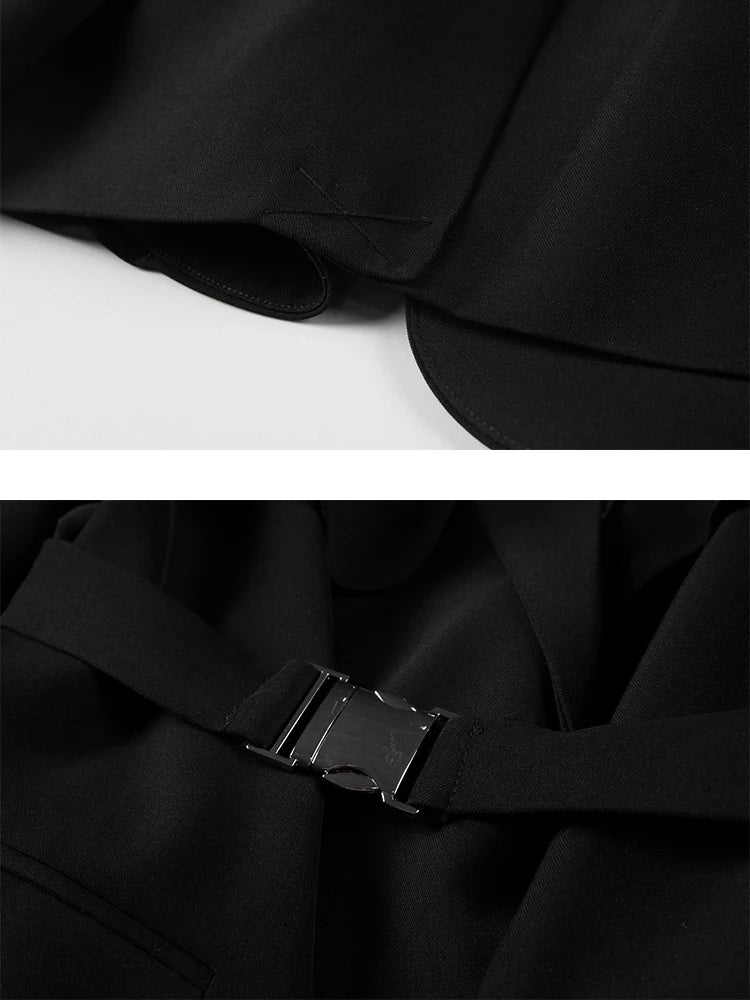- Style: Longline blazer with a cinched waist and adjustable belt