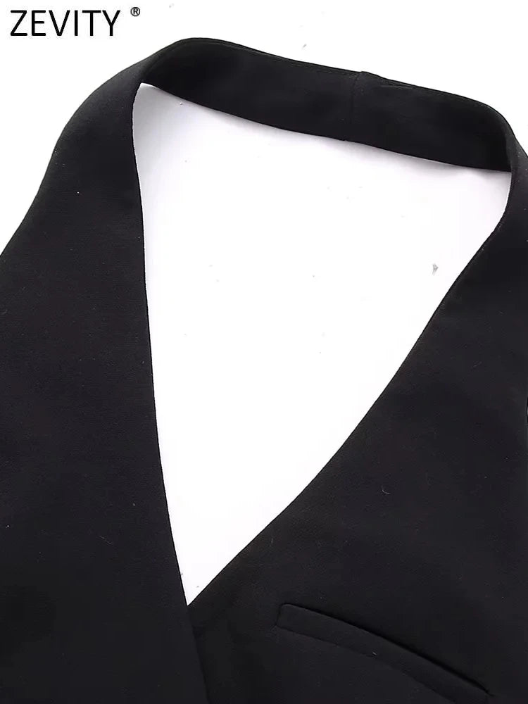 Make a bold fashion statement with this Women's Halter Neck Vest with Double Belt Accent, designed to add a sleek and modern touch to any outfit. Crafted from high-quality fabric, this sleeveless vest features a sharp V-neckline and an elegant halter neck design that showcases your shoulders while creating a flattering, structured fit.